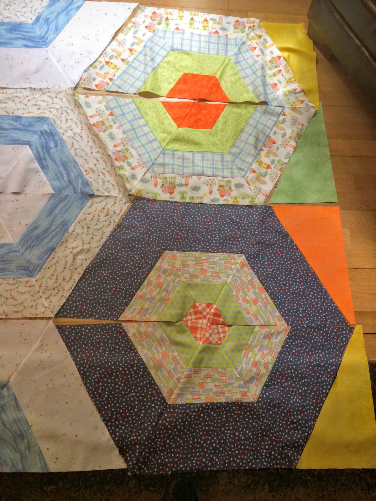 In this picture the first right seams are sewn together which means all the rectangles are now sewn to the half hexagons. Right now I'm only focusing on the seams running vertically. After all the vertical seams are sewn up I'll sew the horizontal seams.
